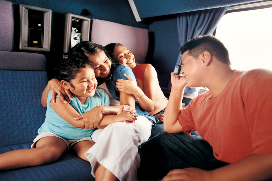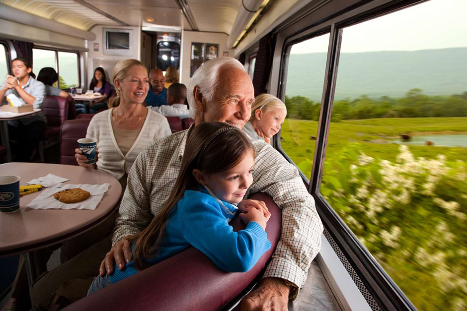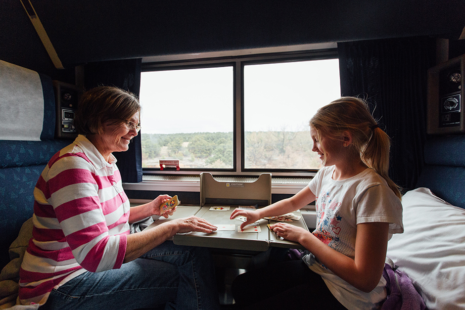 Amtrak’s Sleeping Car accommodations provide overnight travelers the choice of a roomette, bedroom, bedroom suite (two adjoining bedrooms) that can accommodate one to four people, and accessible bedrooms. In a roomette, daytime seating converts to beds at night. Electrical outlets, climate controls, reading lights, a small closet, and a fold-down table are all within easy reach. Bedrooms are larger than roomettes and offer a sink and vanity with enclosed toilet and shower facilities. Spanning the width of the train car, Amtrak’s family bedrooms are a cozy option for a family of four. Each family bedroom comes with two sets of bunk-style beds, a sofa, and two reclining seats. This more spacious room gives mom and dad (or grandma and grandpa) their own personal space, but more importantly, their own personal bed separate from the kids.